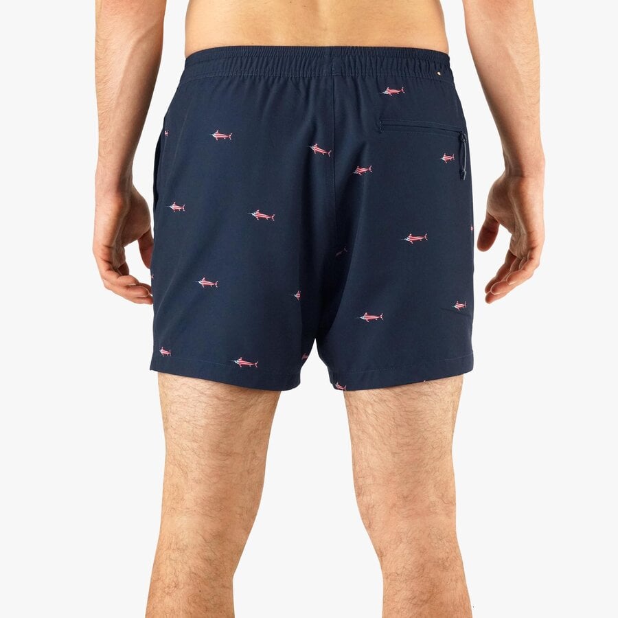 These swim shorts will help you stand out from the crowd. The AFTCO Strike Swim Shorts in Deep Navy provide excellent protection against the elements whether you're on or off the water. Featuring a tropical print, these shorts come with an active fit, elastic waistband, and drawcord, ensuring a comfortable and adjustable fit. The mesh liner and multiple pockets enhance their practicality and functionality.