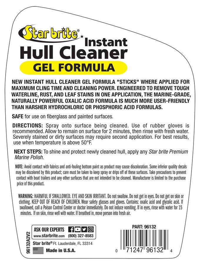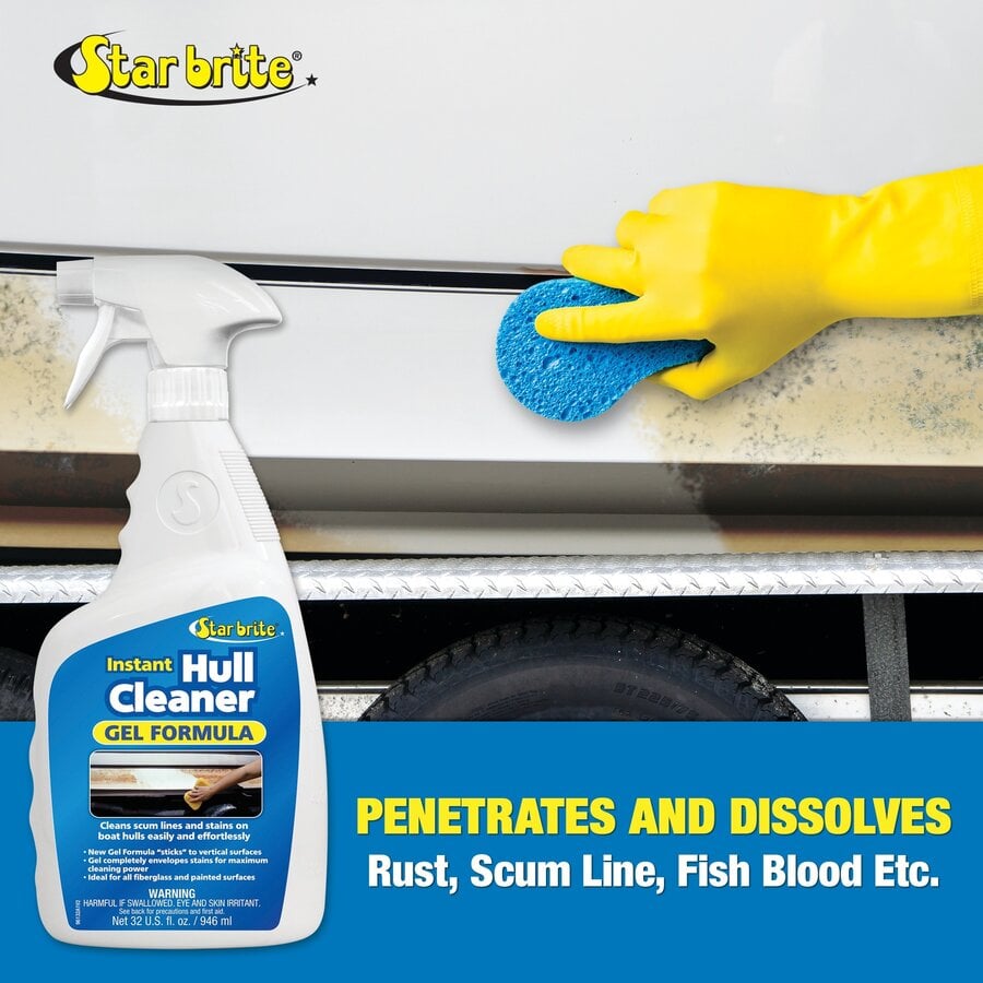 Star brite Hull Cleaner Gel Spray is designed to tackle the toughest stains on boats. This 32 oz spray gel effectively removes rust, dried fish blood, and leaf stains from all fiberglass and painted surfaces. It's ideal for vertical surfaces, ensuring a thorough clean without harmful acids, making it both safe and easy to use.